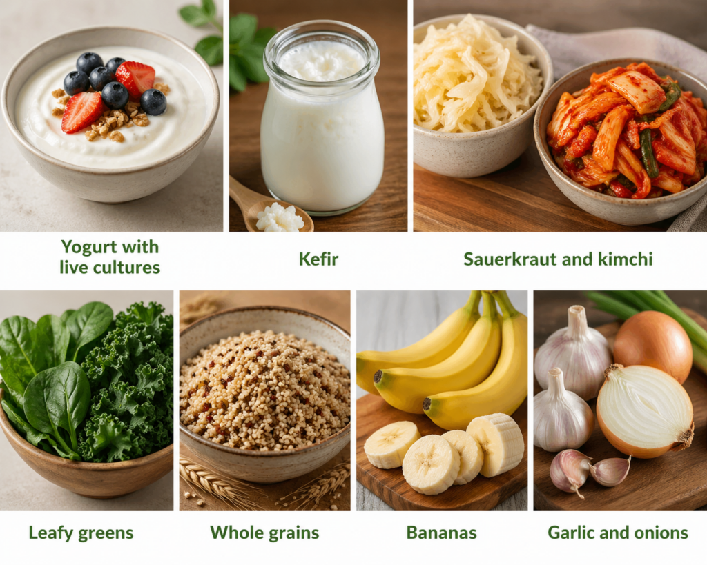 These foods either contain probiotics (good bacteria) or prebiotics (fiber that feeds that bacteria), helping your gut stay balanced and happy.