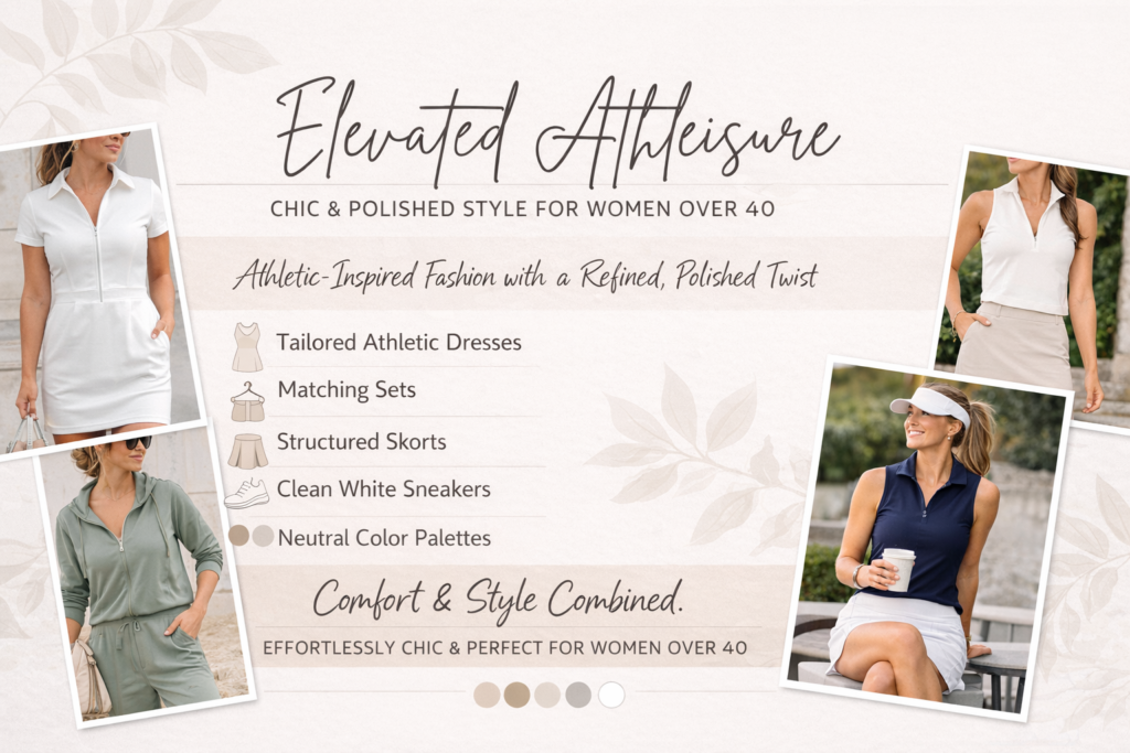Elevated athleisure is athletic inspired fashion styled in a refined and polished way. Think tailored athletic dresses, structured skorts, matching sets, clean white sneakers and neutral color palettes. This style works especially well for women over 40 who want to look stylish while staying comfortable. Explore polished casual outfits that combine comfort, versatility, and effortless chic fashion.