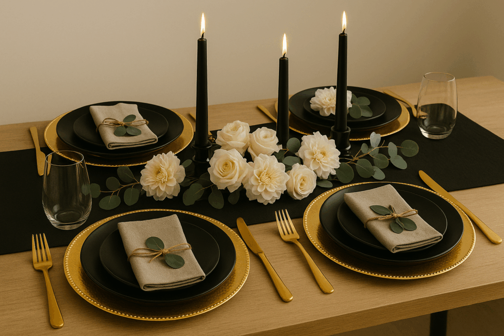 This glam holiday tablescape combines sleek black dinnerware, gold flatware, and tall black taper candles for a dramatic, editorial-worthy look. Layer in glossy candleholders, textured linens, and a touch of greenery to soften the contrast while keeping the vibe luxe and modern.
