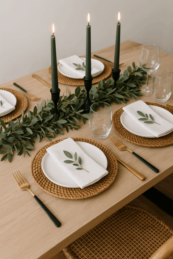 - Run a loose garland of eucalyptus and olive branches down the center—let it drape naturally for that relaxed, organic feel.