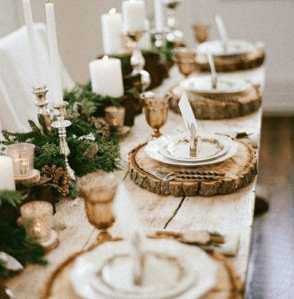 - Add wood slices, woven placemats, stoneware plates, and napkins tied with twine and a single leaf or herb.