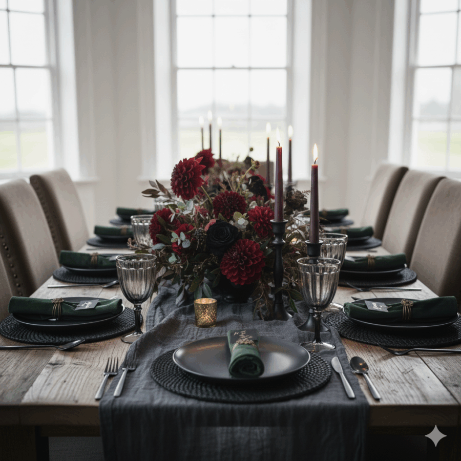 - Add velvet or textured napkins in moody shades to soften and warm the look.