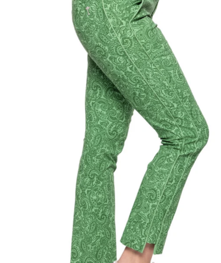 Experience luxury and style with our Green Paisley Stretch Ankle Pant. The striking paisley print adds a touch of elegance, while the water-resistant fabric ensures lasting wearability. With piping detail down the side, these pants are not only pretty but also versatile and fashionable. Elevate your wardrobe today. Use GALPAL for 15% off.