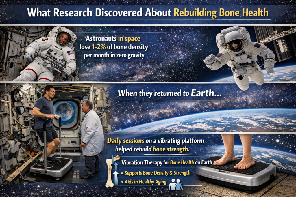And here’s the part I found fascinating. Research originally came out of space medicine. Astronauts living in space lose about 1–2% of their bone density every month due to zero gravity. When they returned to Earth, scientists discovered they could help rebuild bone strength simply by standing on a gently vibrating platform for short daily sessions. That finding helped researchers realize vibration therapy might play a meaningful role in protecting bone health for people here on Earth too — especially those of us wanting to stay strong, active, and independent as we age.